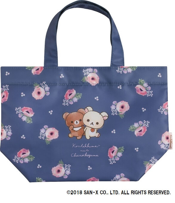 ネイビー地に上品なお花とコリラックマ、チャイロイコグマがあしらわれたミニトート。