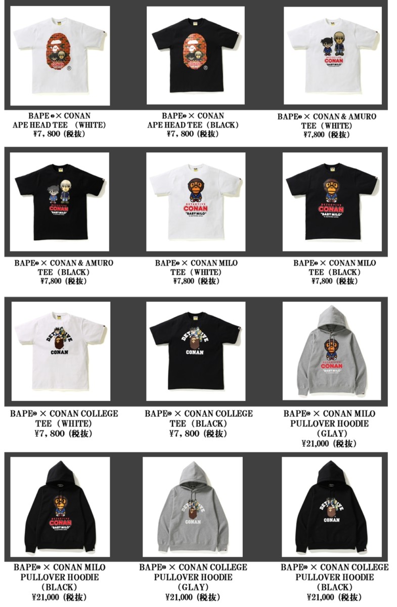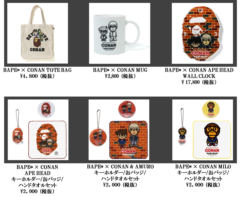 このコラボレーションにおいて、「A BATHING APE®」は「BABY MILO®」がコナンに扮したTシャツやパーカー・オリジナルクロックなどのアイテムを、