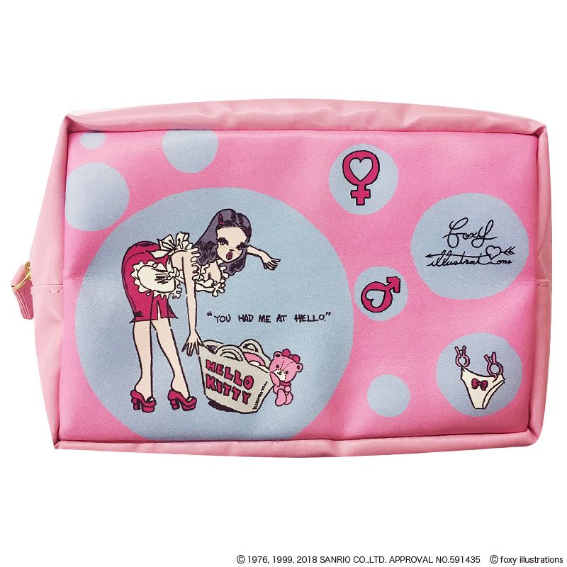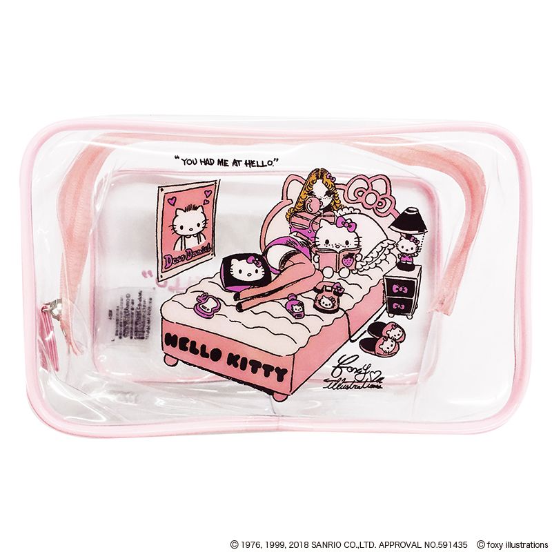 ベッドルームでキティちゃんとくつろぐ女の子がデザインされたビニールポーチ。